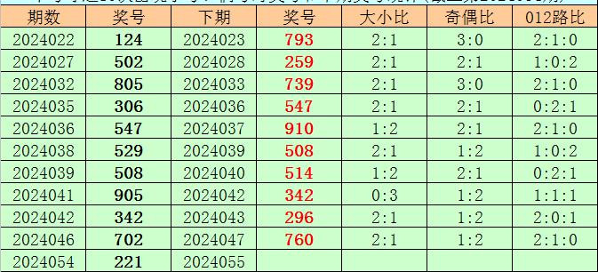在中号球前10次开出小号、偶号类型之后,其下期分别开出奖号:793、259、739、547、910、508、514、342、296、760,其中号码大小比为4:6,012路比为5:4:1,奇偶比为6:4。