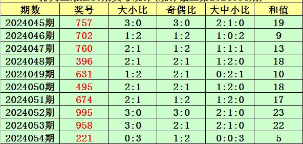 上期回顾:排列三第2024054期奖号为:221。奖号类型:组三,和值:5,奇偶比:1:2,跨度:1,大小比:0:3。