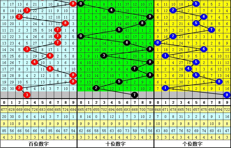 大中小分析:在组选0-9号码分布图中,前10期小号(0-2区段)出现7枚奖号,中号(3-6区段)出现12枚奖号,大号(7-9区段)出现11枚奖号,上期奖号全在小号区域,本期注意小号走冷,防0-2区段断区。