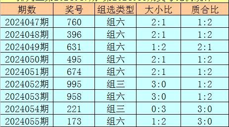 上期回顾:排列三第2024055奖号开出173,奖号质合比为3:0,大小比为1:2,跨度为6,类型为组六。