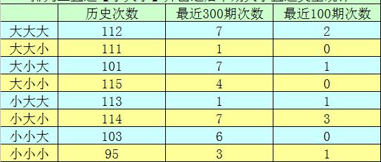 2.在前9次直选【小大小】组合之后,下期开奖号码分别为:572-945-482-089-888-080-081-985-124,豹子包含1期,组三包含1期,组六包含7期。本期奖号排除对子,看好开出组六。