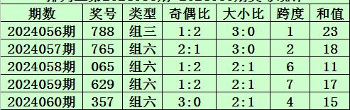上期回顾:排列三第2024060期开奖号码为357。奖号类型为组六,奇偶比为3:0,大小比为2:1,跨度为4,和值为15。