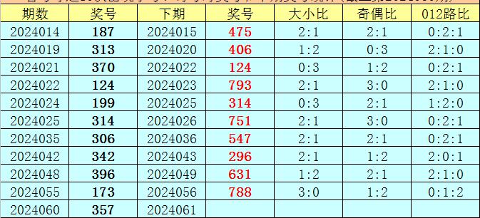 在首号球前10次开出小号、奇号类型之后,其下期分别开出奖号:475、406、124、793、314、751、547、296、631、788,其中号码大小比为5:5,012路比为2:6:2,奇偶比为6:4。