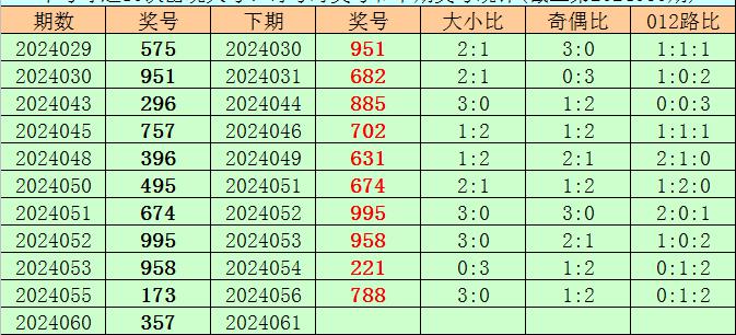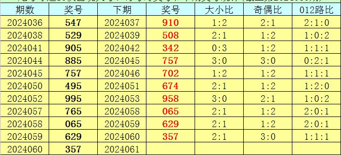 开奖回顾:体彩排列三第2024060期开出奖号357,奖号大小比开出2:1,奇偶比开出3:0,012路比开出1:1:1。