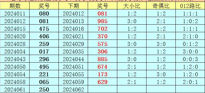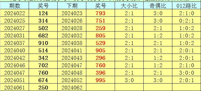 开奖回顾:体彩排列三第2024061期开出奖号250,奖号大小比开出1:2,奇偶比开出1:2,012路比开出1:0:2。