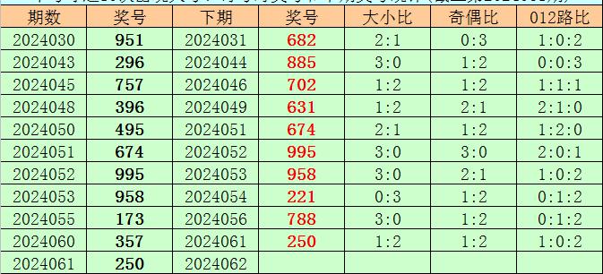 在中号球前10次开出大号、奇号类型之后,其下期分别开出奖号:682、885、702、631、674、995、958、221、788、250,其中号码大小比为7:3,012路比为3:1:6,奇偶比为5:5。