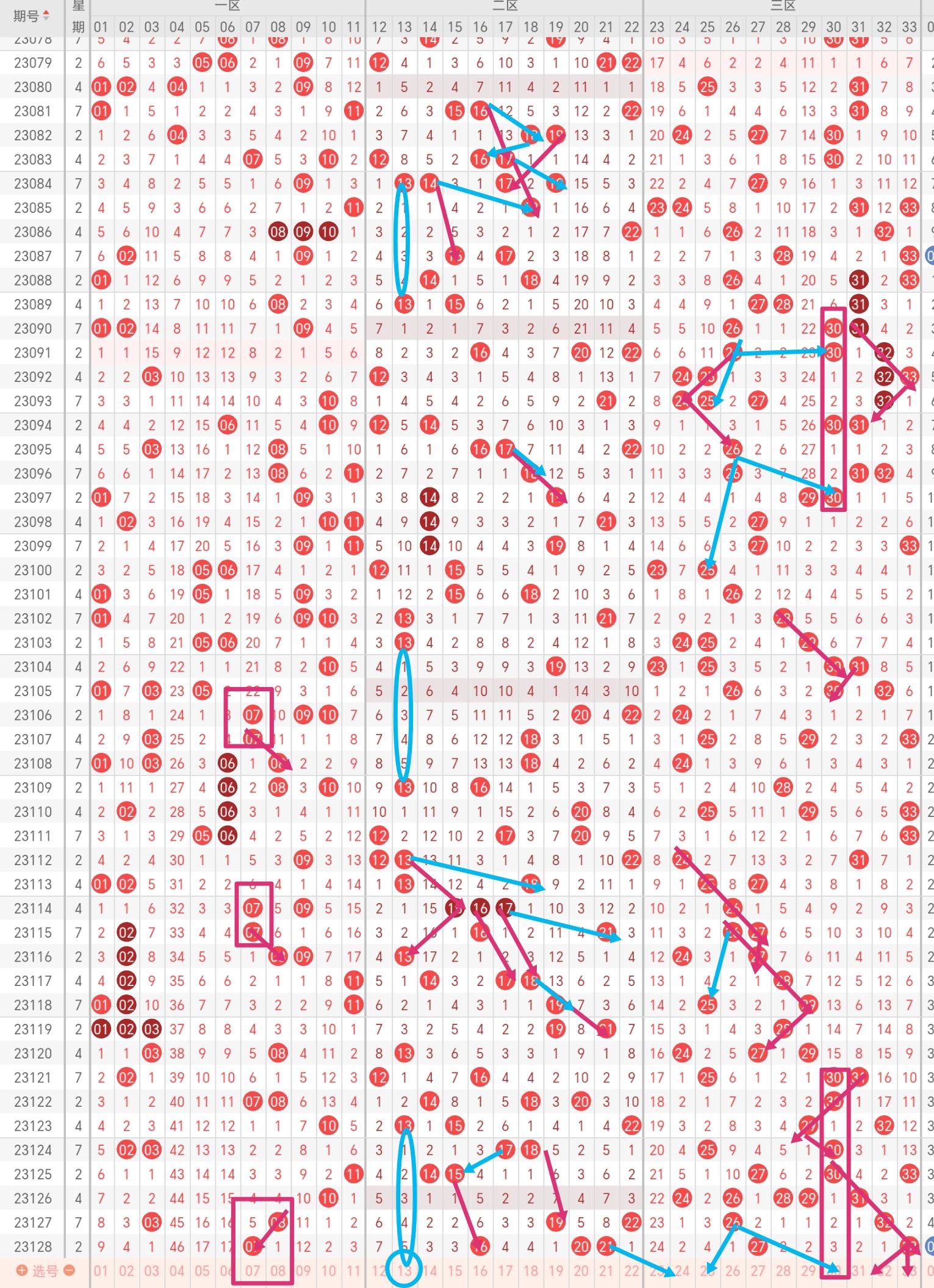 再来分析一下红球号码。如下图所示,诺言重点关注的是一处出现连号的情况。从诺言标注的箭头的走势可以看见,出现连号的时候,下一期很容易出现它的邻号以及间隔1到2个号码的号码(如下图所示),再下一期也会有很大概率出现连号的邻号。本期32和33出现的概率也很大;本期24、25、27和30出现的概率也比较高。
