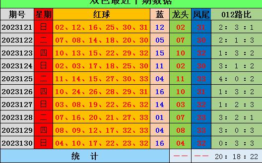 上期回顾,双色球23130期开出奖号:红球041017222332,蓝球16。当期红球号码大小比为4:2,三区比为2:2:2,奇偶比为2:4。本期红球开出重号1732,开出连号2223。蓝球开出大偶数球16。