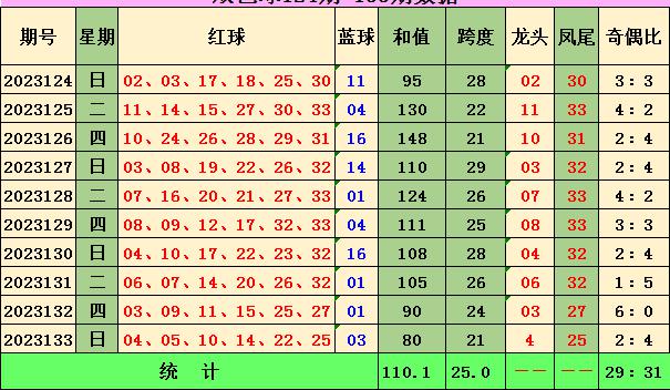 上期回顾,双色球23133期开出奖号:红球040510142225,蓝球03。当期红球号码大小比为2:4,三区比为3:2:1,奇偶比为2:4。本期红球开出重号25,开出连号0405。蓝球开出小奇数球03。
