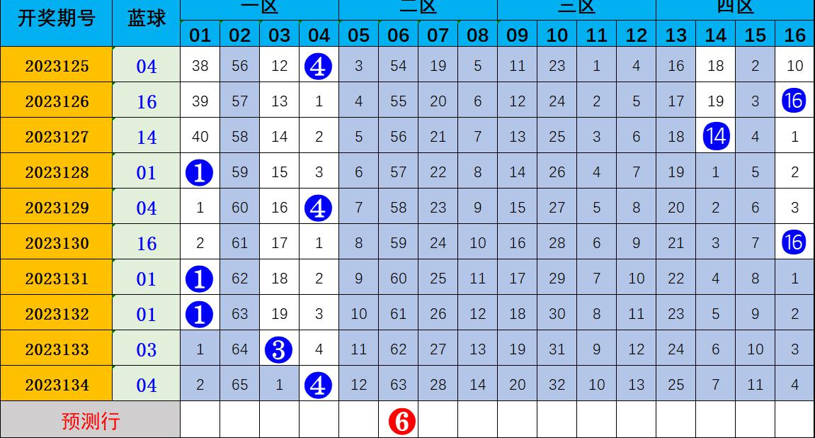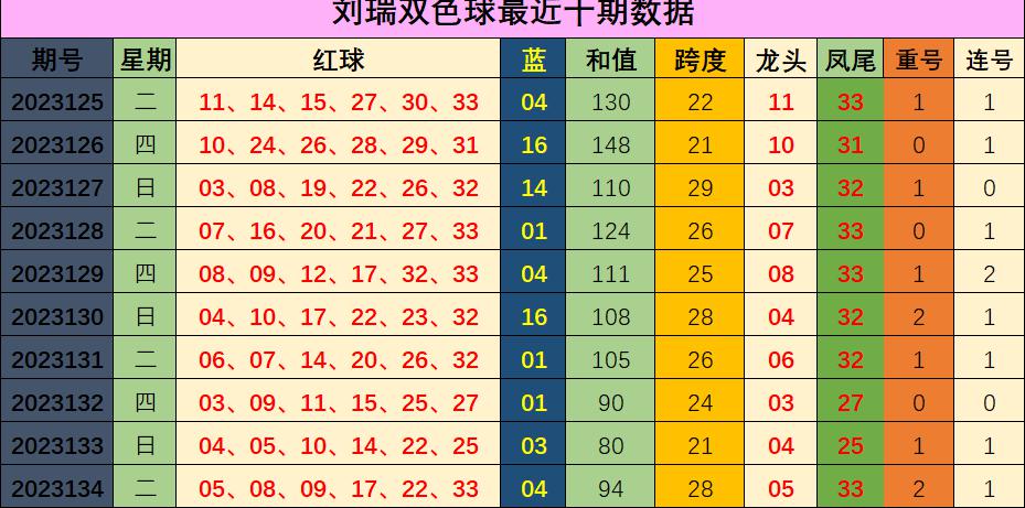 基本走势:和值走势分析:上期和值为94,对比前期上升14个点位,最近10期红球平均和值为110.0,根据图表分析,本期预测和值相比上期上升走势,预计本期红球和值120-125之间开出。跨度走势分析:近10期跨度平均值为25.0,上期红球跨度为28,相比上期跨度上升7个点位开出,近十期内有5期2926282628超过平均跨度,根据图表分析,本期预测跨度相比上期下降趋势开出。关注跨度范围在18。龙头凤尾:上期龙头开出05,与前期上升1个点位开出,近十期龙头有4期集中在01-04,龙头小号出现较冷,本期龙头预测比上期上升趋势,推举2区号码出现,特别关注号码12。上期凤尾开出33,相比前期上升8个点位开出,近十期凤尾有8期开在30以外,凤尾30以外出号较热,本期预测凤尾号码下降趋势开出,推举三区出现,关注30以外的凤尾开出,推荐30。重号走势:上期开出重号0522,最近十期中7期开出重号,重号落码比例较热,根据图表综合分析,本期预测重号开出,关注重号22.连号分析:上期开出连号0809,最近十期8期开出连号,连号走势近十期较热。根据图表综合分析,连号十期出现8期,本期预测连号再度出现,关注连号1213.蓝球分析:蓝球分析:上期开出号码06,较上期上升2个点开出,近10期蓝球开出7次小号04010401010304,3次大号161416,大小比3:7,近十期小号表现较热。本期预测蓝球2区偶数号码出现,蓝球重点关注偶数号码06。