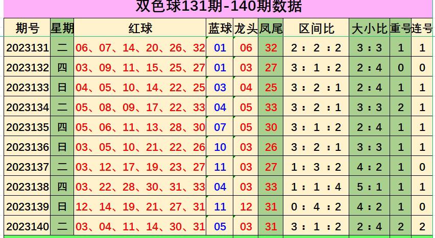 双色球第2023140期出奖号统计:红球030411143031,蓝球,05,和值为93,跨度28,龙头03凤尾31,三区比为3:1:2,012路比为2:2:2,奇偶比为3:3,大小比为2:4,冷热比为2:4,2枚重号,2组连号。