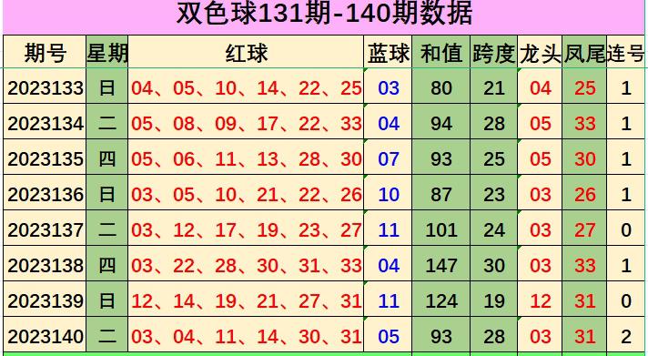双色球第2023140期出奖号统计:红球030411143031,蓝球,05,和值为93,跨度28,龙头03凤尾31,三区比为3:1:2,012路比为2:2:2,奇偶比为3:3,大小比为2:4,冷热比为2:4,2枚重号,2组连号。
