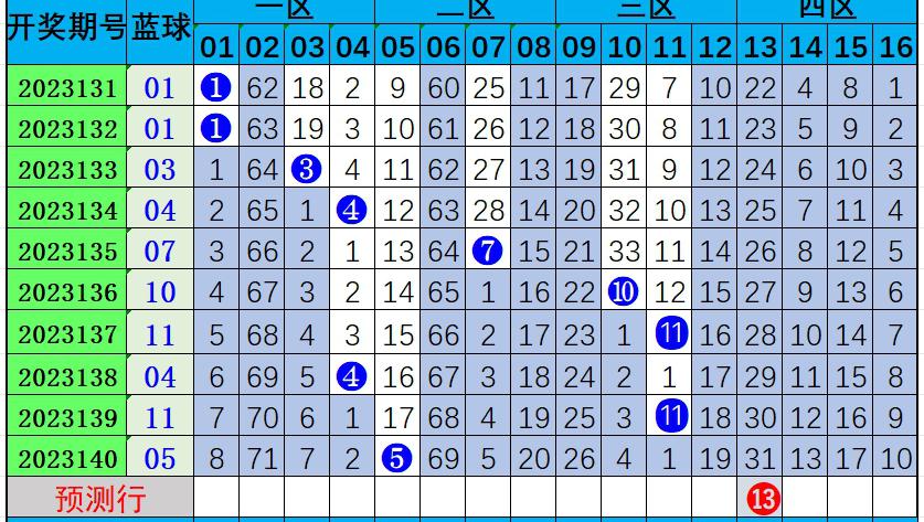 蓝球分析:上期开出蓝球号码05;近十期蓝球号码大号开出3期,小号码开出7期,小号走势较热;近十期蓝球号码奇号开出7期,偶号开出3期,奇数号走势较热。根据总表走势,本期看好号码0405101315,优先考虑蓝球13。