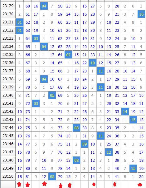 上图红框数字为开奖号码,其它数字为号码的遗漏值(离上次开出间隔的期数),比如上图中号码01的遗漏值为9,号码02的遗漏值为1,号码03的遗漏值为2.....)。