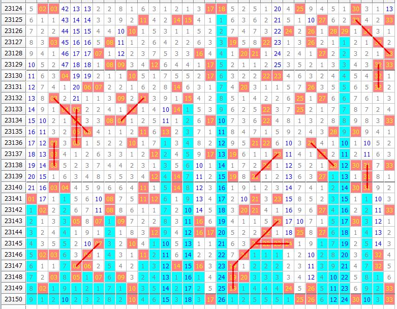 遗漏0-1 期的热码(重码加隔期码)上期开3枚,本期有02 10 17 19 24 25 26 30 33共9枚,重码上期开出3枚,近期趋向活跃,本期难言必开,预测本期重码开0-1枚。隔码上期开出0枚,按近期跟随表现,本期应该有开出,预测本期隔码开1-2枚。综合起来,本期热码(重码加隔码)应该一般,预测本期热码开1-2枚。