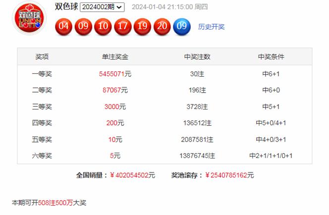 双色球第2024002期开出奖号为04、09、10、17、19、20+09。其中红球号码奇偶比为3:3,三区比为3:3:0,大小比为3:3,蓝球开出奇数号码09。