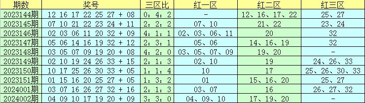 双色球第2024002期开出奖号为:04、09、10、17、19、20+09,其中红球三区比为3:3:0,蓝球开出奇数、大号、0路号码。