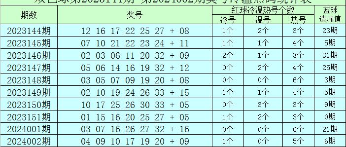 赵千里双色球第2024003期奖号冷温热码统计分析(定义,遗漏0-4期为热码,遗漏5-9期为温码,遗漏10期及以上为冷码)