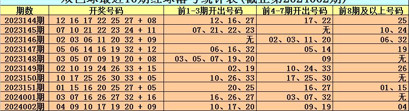 上期开奖:双色球第2024002期奖号为:040910171920+09,其中红球10、17、20包含在前1-3期的奖号中,红球09、19包含在前4-7期的奖号中,红球04包含在前8期及8期以上的奖号中。
