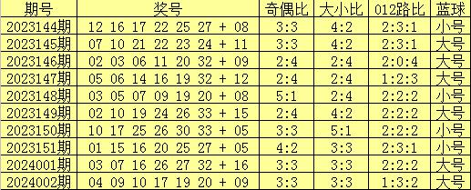 双色球第2024002期开奖号码:040910171920+09。红球大小比为3:3,奇偶比为3:3,012路比为1:3:2,蓝球为大号。