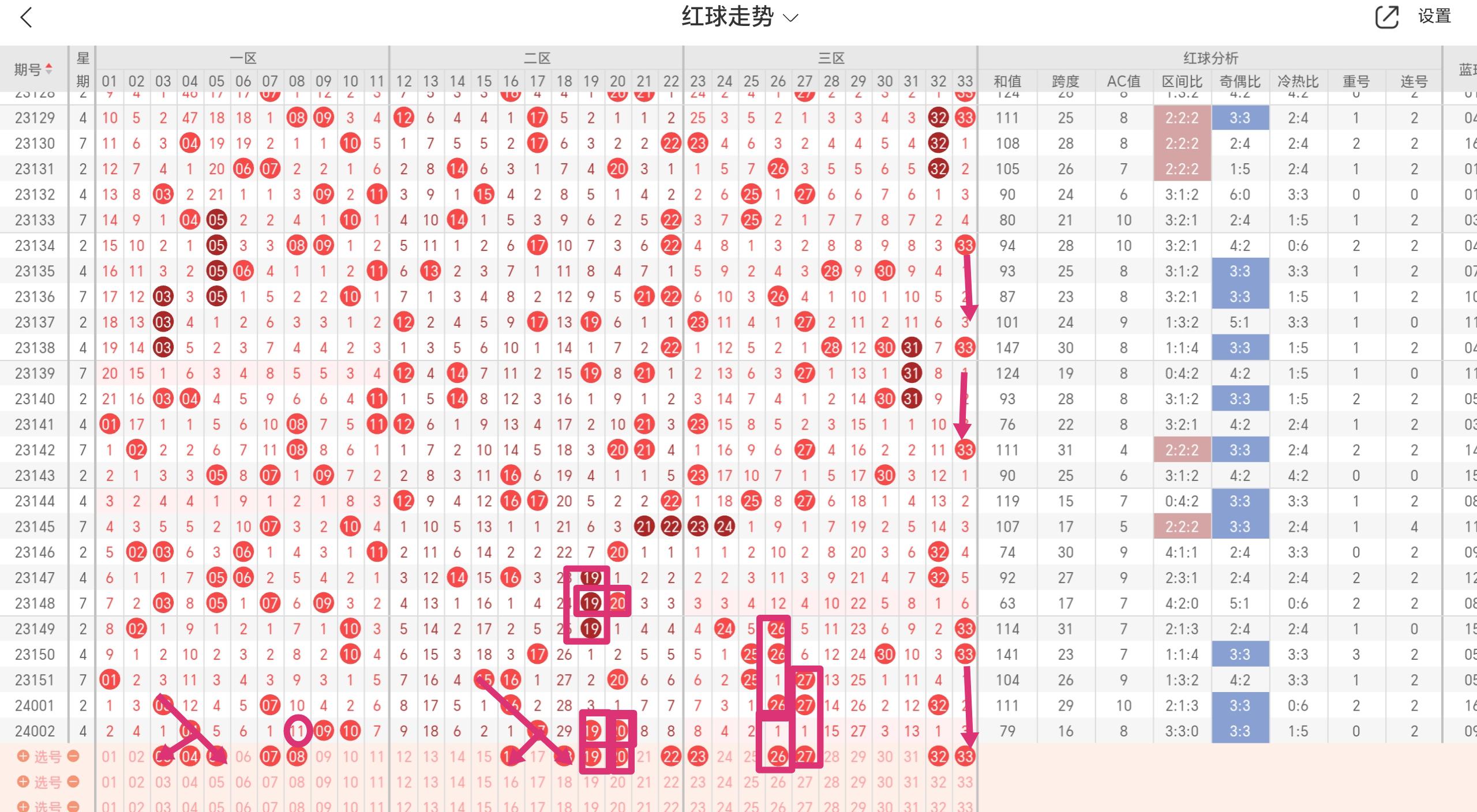 再来分析一下红球号码。如下图所示,诺言重点关注的是几处出现斜连号的情况(15、16、17)。从诺言标注的箭头的走势可以看见,出现三连斜连号的时候,下一期很容易出现它的下一个斜连号18以及间隔1到2个号码的号码(如下图所示),再下一期也会有很大概率出现隔落号16。往期三期出现0个号码的时候,就会在下一期出现至少2个号码,本期26、27出现的概率也很大;其次再来分析二区间上期开奖号码19、20出现连号,在2区间里出现有连号的时候,在后一期后会出现重号,而且本期构成重的概率确实非常大。所以本期19、20出现的概率也比较高。