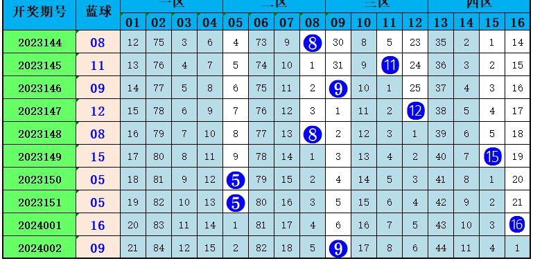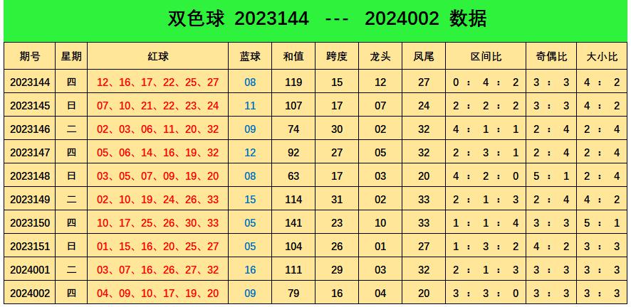 上期回顾:双色球第2024002期开出奖号:红球04、09、10、17、19、20;蓝球09,其中红球三区比为:3:3:0,奇偶比:3:3,大小比为:3:3,蓝球开出0路号码09。