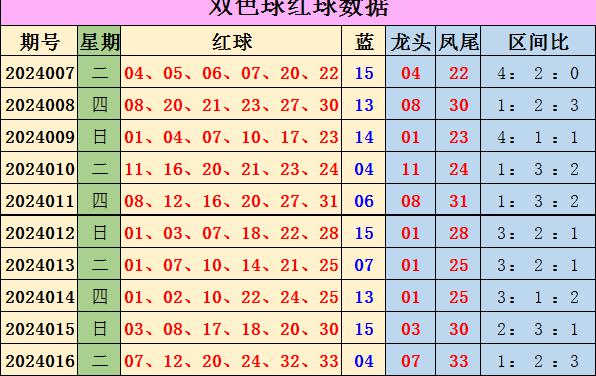 双色球第上期开出奖号统计:红球07、12、20、24、32、33,蓝球04,龙头07,凤尾33,三区比为1:2:3。