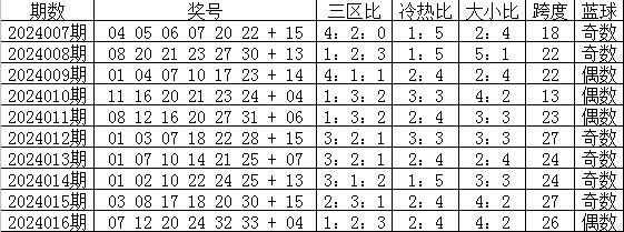 双色球第2024016期奖号为:07、12、20、24、32、33+04。其中红球三区比为1:2:3,和值为128,大小比为4:2,冷热比为2:4,跨度为26,蓝球为遗漏5期的偶数号码。
