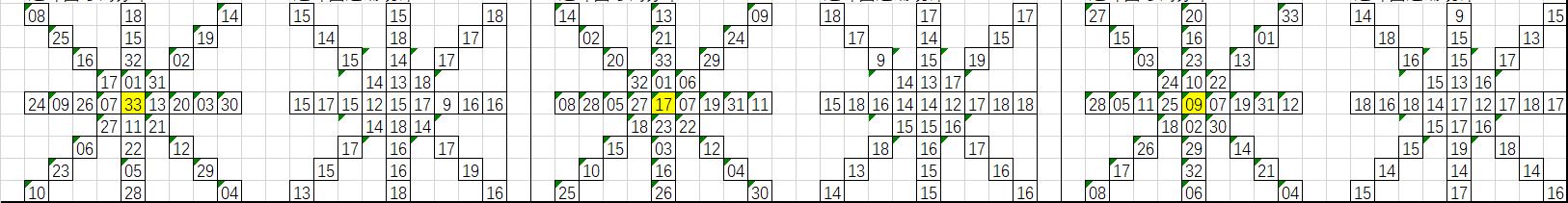 以上是33、17、9的连环图,可以在为彩网平台的九转连环图中查看历期号码分布,以当前期数来看,历史同期共有19期(2003-2023),那么我们就以19期号码来进行遗漏统计,然后把每个号码在近19期的遗漏总数统计出来,分别带入33、17、9的连环图,取出遗漏值大于16的号码,把这些号码在“环上”和“轴上”的相邻号码取出来进行统计,选取出次前15的号码作为大底。