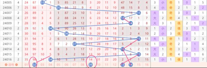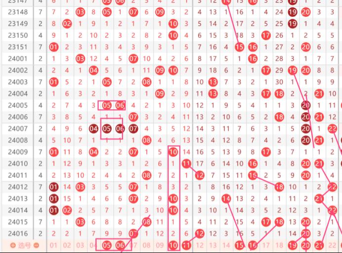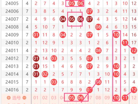 参照上图,005-007期下落出号05、06连号形态,仿制其形态,本期05、06俩个号出号明显,且06码数可构成斜连三码走势,须关注;013-014期开出10码数落重形态,参照其形态,目前10码数间隔两期未开出,本期10码数有概率出号,并构成互补形态,须关注;010-011期开出11、12连个码数构成斜连,上期12码数下落出号,本期11码数出号明显,须防守;