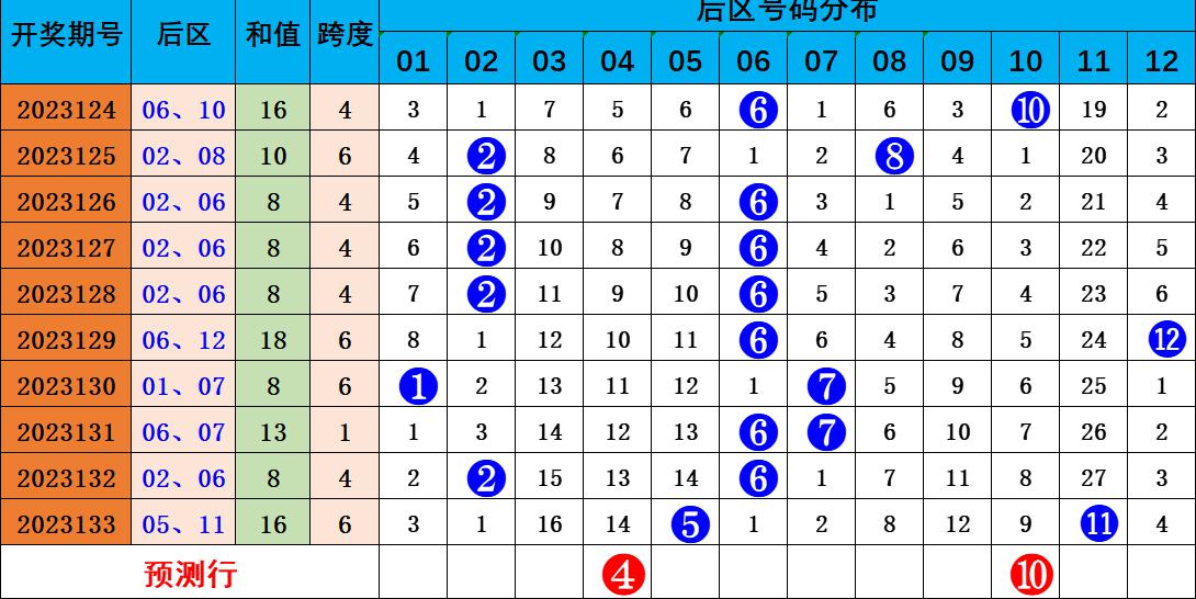 三区分析:上期前区三区比为1:1:3,近十期三区比为18:15:17,根据图表分析总体一区较热,二区较冷,三区较温,根据图表分析,本期预测一区较温,二区较温。三区较冷。本期预测三区比为2:2:1,特别关1区2区出号优势。冷热走势分析:上期冷热比为3:2,近十期冷热比26:24,近十期冷码走势较热。根据图表分析,本期预测冷码热出,推荐冷热比为4:1,特别关注冷码多出。特别关注冷码02151631.重号分析:上期开出重号0,重号最近10期出现6期,比例为60%,走势较热,根据图表分析,十期内出现6次重号,上期开出重号0,本期预测不会出现重号。.连号分析:上期出现连号0,连号最近10期出现6期,比例为60%,走势较热,根据图表分析,连号10期内开出6次,本期预测连号再度出现,关注连号1516.后区分析:上期开出后区号码:0206,偶偶组合。十期内出现7次偶偶组合,2次奇奇组合,0次奇偶组合,1次偶奇组合,奇偶组合较冷,根据图表分析,本期预测偶偶组合开出,本期预测号码:0304060910。精准推荐:0410。