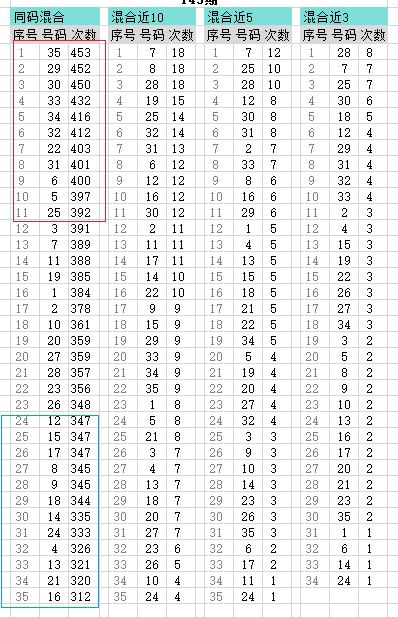 以历史同码父子表为基础,本期分别对142期的7个号码:04、13、15、17、32 + 10、12做统计汇总,并分别统计前后区近10期,近5期、近3期所产生的子码表。