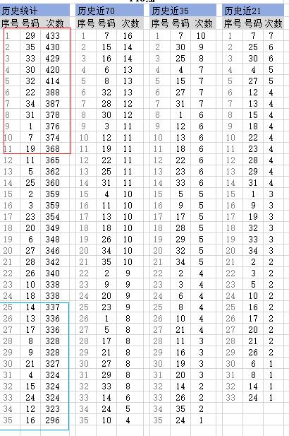 历史频次表指的是超级大乐透开奖至今,所有号码出现的次数排序表。在历史频次表的基础上,我对前区和后区进行了单独统计,前区分别统计了近70期、近35期、近21期,所有号码出现的次数排序;后区分别统计了近60期、近30期、近18期所有号码出现的次数排序。