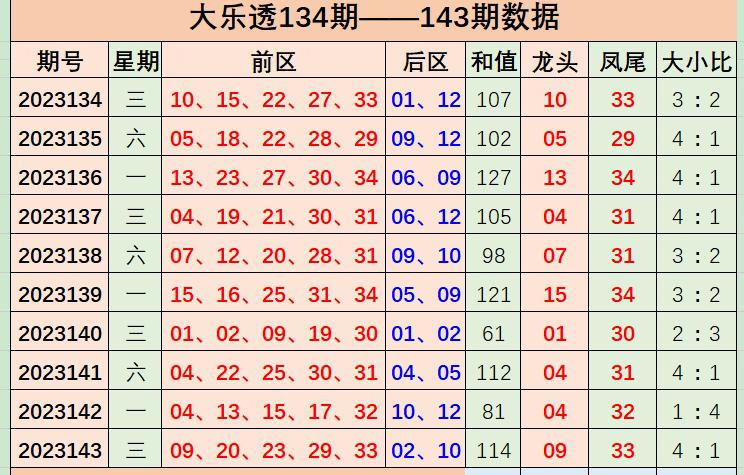 大乐透第2023143期开奖号码:前区0920232933,后区0210;龙头09,凤尾33,和值114,跨度24,前区号码区间比1:2:2,012路比2:0:3,奇偶比为4:1,大小比为4:1,冷热比3:2,0枚重号,0组连号。