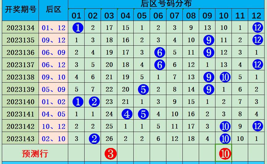 上期后区号码为02号和10号,为小大、偶偶组合,近5期后区小大组合出现2期,偶偶组合出现1期,奇奇组合出现1次。本期大范围看好号码0103091012,重点推荐小大、奇偶组合0310。