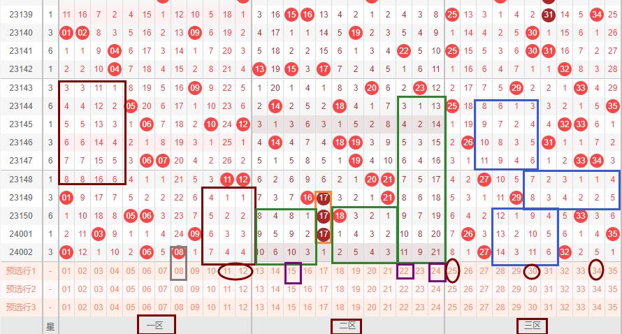 师妹利用以上两组方法组合,就可以选出红号区可能开出的号码来:一区08、11、12;二区:15、22、24;三区:25、30、34
