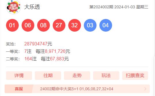 红球:01 06 08 27 32 蓝球:03 04 其中区间比为3:0:2 ,奇偶比为2:3,跨度是31,和值为74