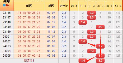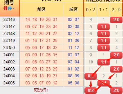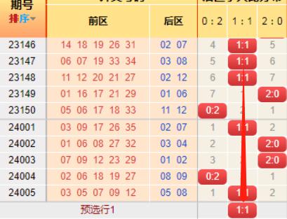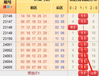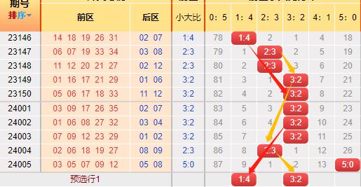 上期前区小大比5:0。言归正传我们继续用历史数据说话,前区小大比分成6种0:5、1:4、2:3、3:2、4:1、5:0(如图),我统计了一下历史出现次数,0:5出现99次、1:4出现461次、2:3出现893次、3:2出现718次、4:1出现302次,5:0出现47次,再看近10期小大比出现次数比为0:1:3:5:0:1,通过历史数据对比观察,冷值0:5不考虑,其余2:3、3:2、4:1纳入考虑范围,根据遗漏对称理论原则,故本期我们还是3:2或4:1;