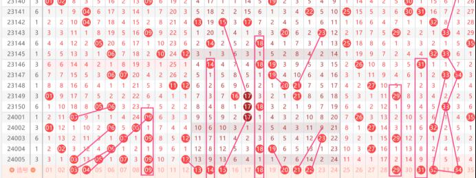 本期前区重点关注 03 09 15 18 20 21 32 34搭配选号04 13 14 22 29 31