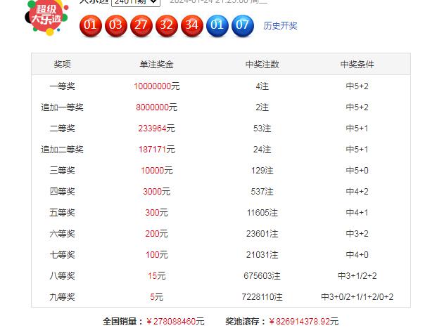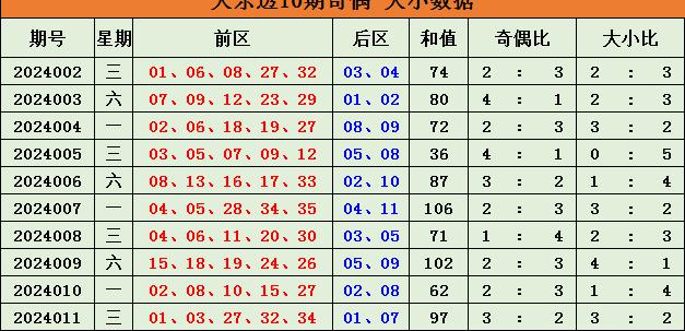 大乐透第24011期开奖。当期开奖号码为:前区0103273234,后区0107。当期前区号码大小比为3:2,奇偶比为3:2,三区比2:0:3;前区开出1枚重号27;后区开出小大组合0107。