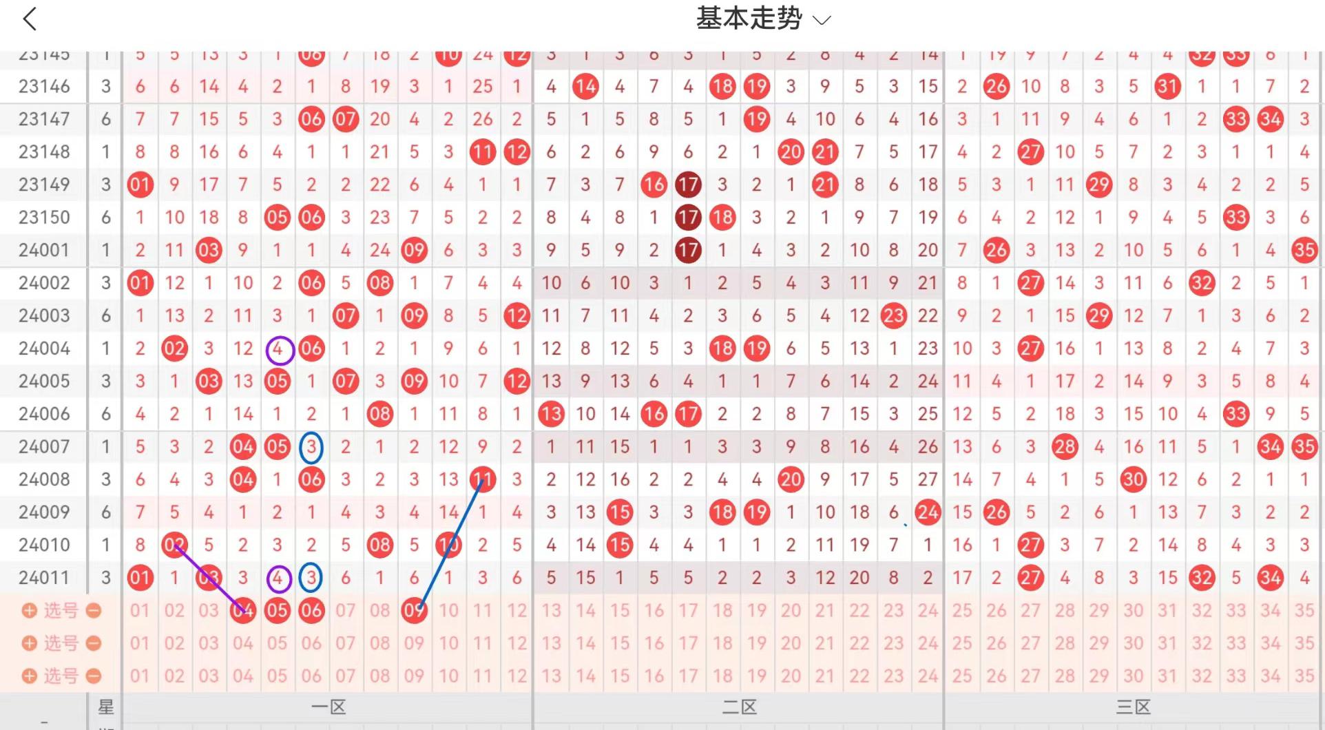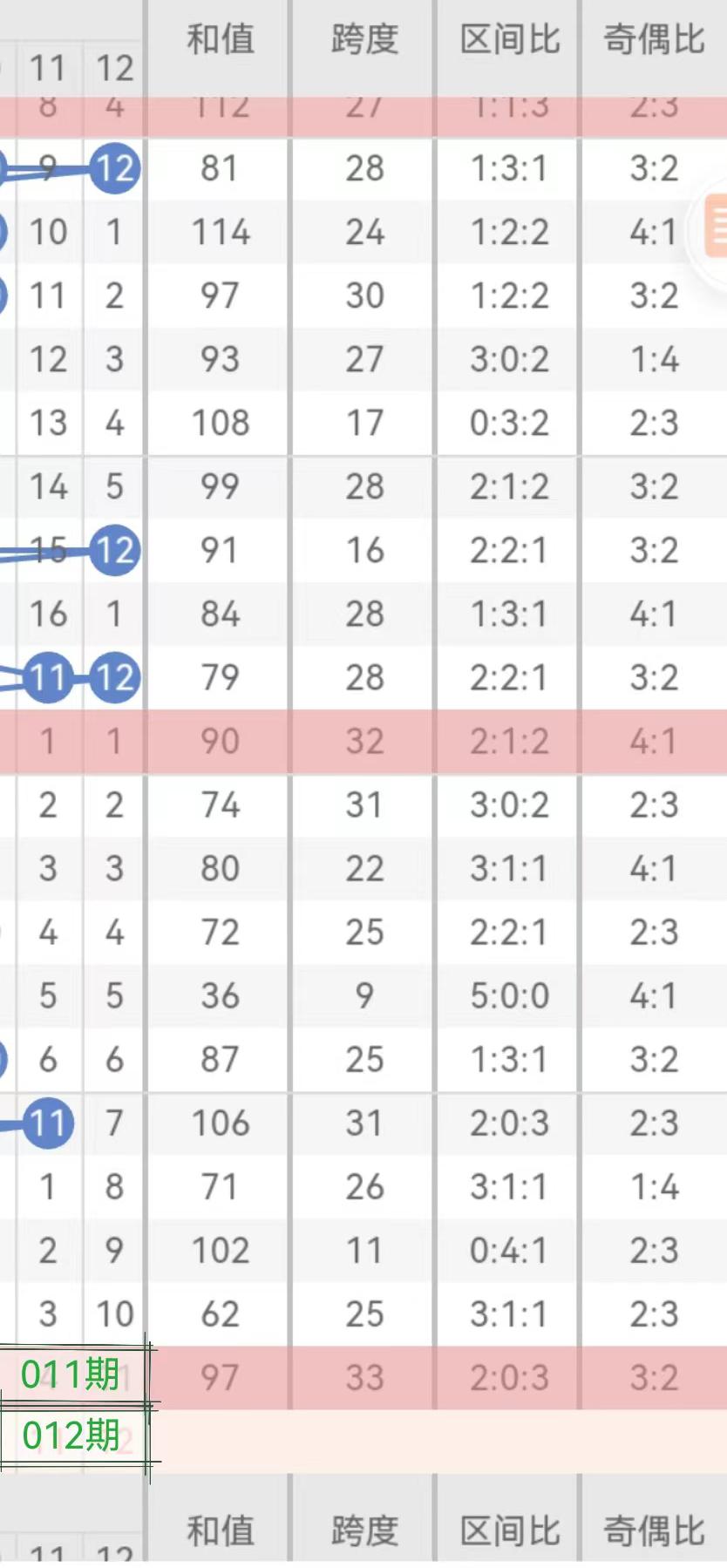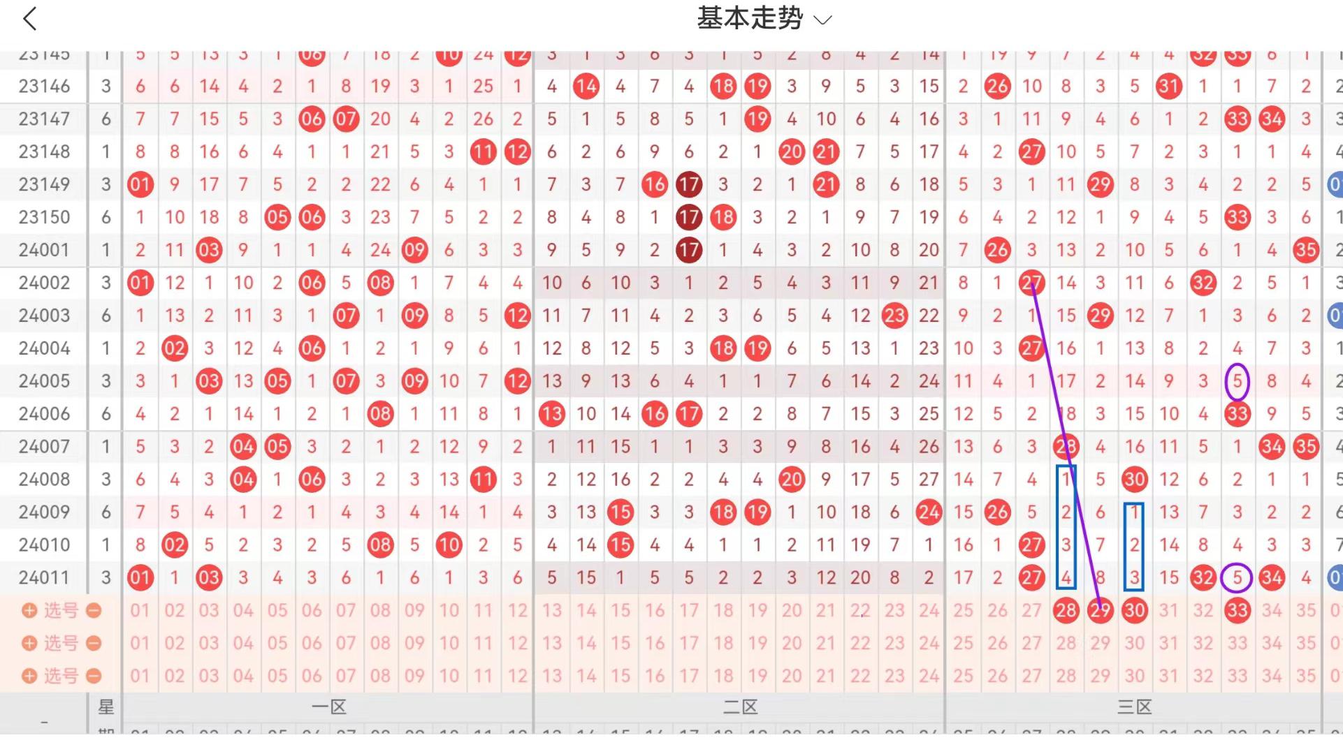 三区间上期(24011期)开出了三码27 -32-34,开出了重号和两个独码,本期做号需要注意重号能否继续开出以及独码位置号码能否有落码,从近期开出的独码来看,在24006期开出的独码下期分了边,在24007期和24008期开出的独码下期放了空,在24009期开出的独码下期分了边,本期独码是放空还是分边需要仔细研判考虑,区间在开出单码落位后开出了三码落位,本期在号码落码位上是会继续开出多码落位还是会走冷开出少码落位需要仔细研判考虑,本期首先需要关注的号码【28】冷号开出后四期回补,然后是【29】八期回补号码带隔空斜连走势,其次是【30】和【33】其中30冷号开出后三期回补,33独码夹号带对称形态,本期重点关注号码有【28 29 30 33】