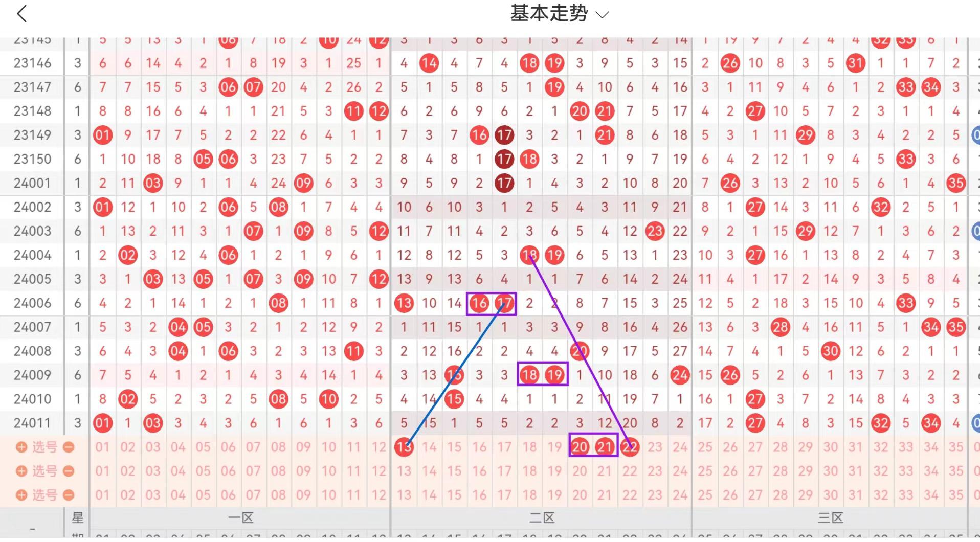 二区间上期(24011期)开出了零码,出现了断区走空,本期断区走空下能回补几码需要仔细研判考虑,从近期断区下回补来看,