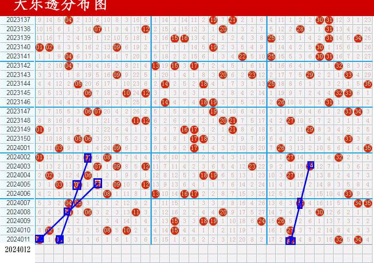 第011期红球三码有明显斜连走势,01号隔二空二三斜连落点;03是空二四斜连落点;27号是空三三斜连落点。