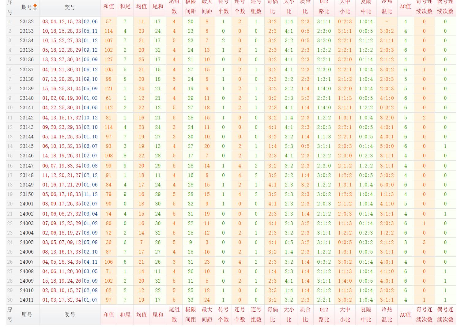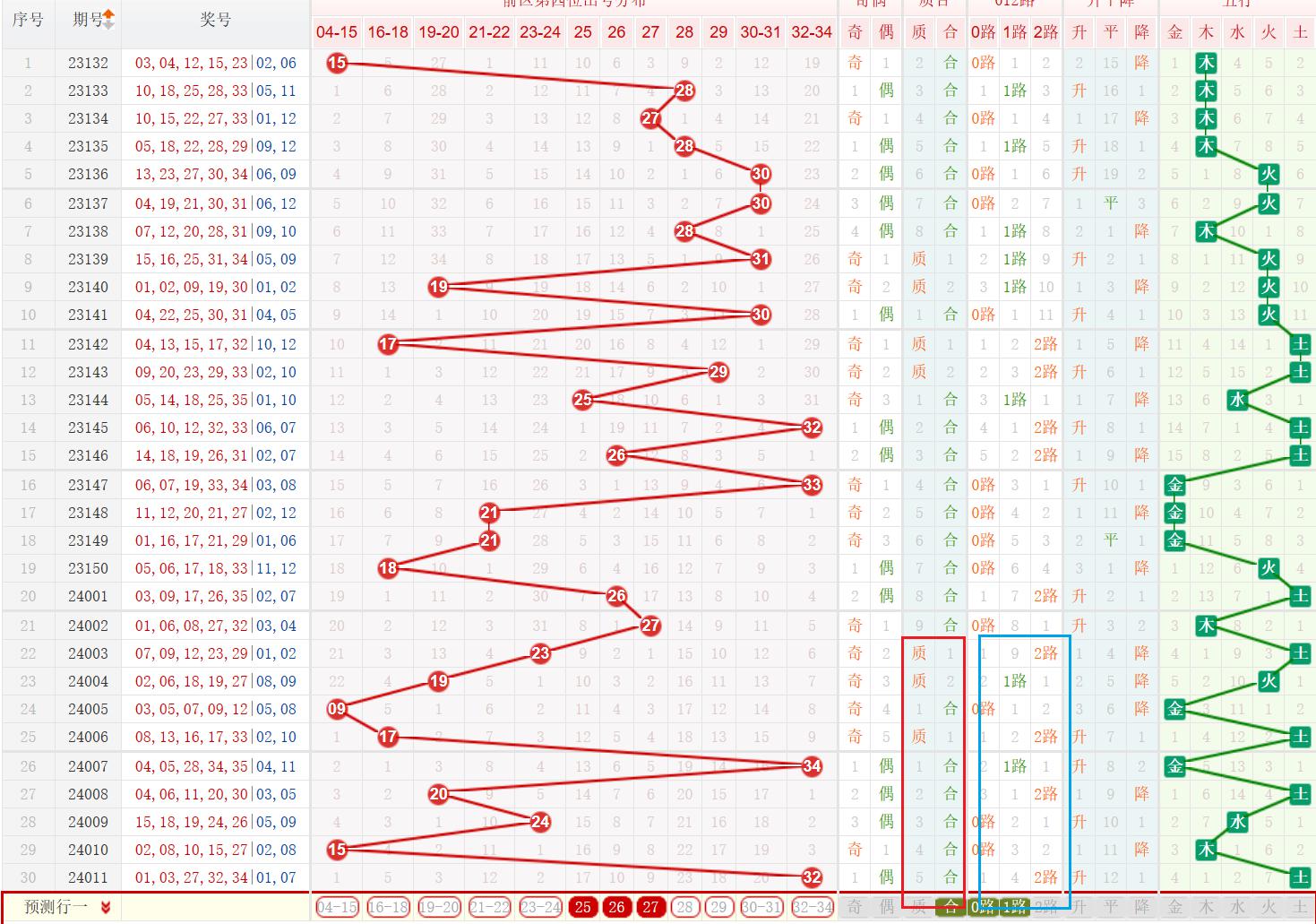从第5位出号分布图可以看出,第5位出号在24-35之间比较常见,上一期开出号码34,为偶数、合数、1路号码。