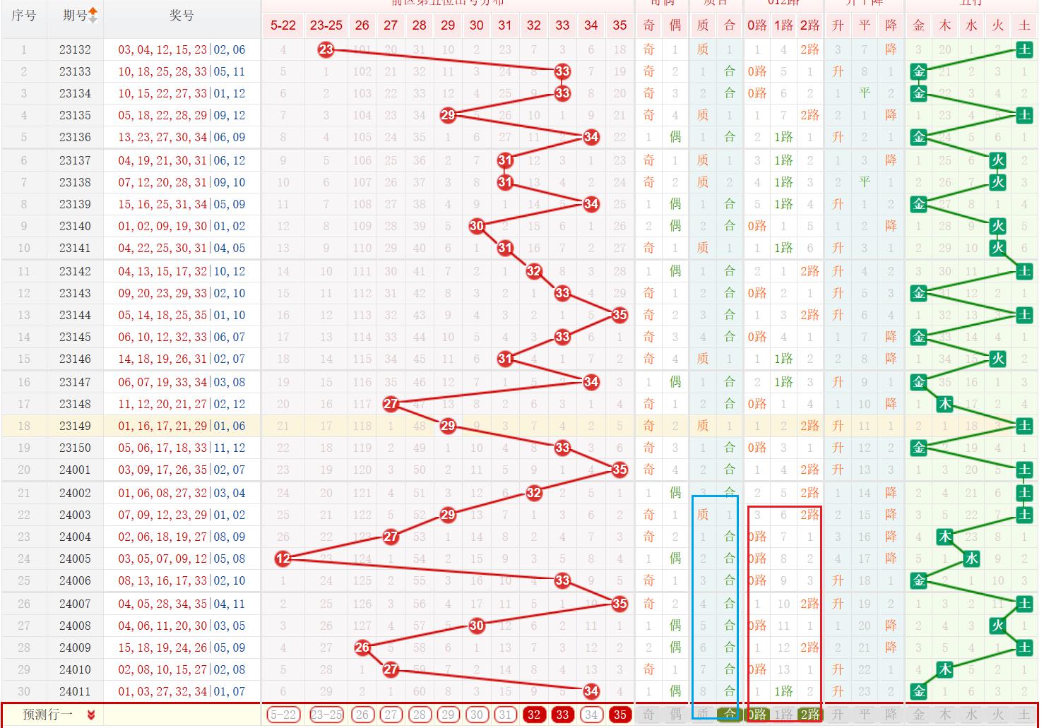 从后区第1位出号大小属性来看,近10期内小数容易连开,上期开出了小数,本期应该仍会开出小数;从质合属性来看,近10期内质数连开趋势强,本期仍看好质数出号;故本期后区第1位应该为小数、质数号码;最后符合条件的为02-03-05。