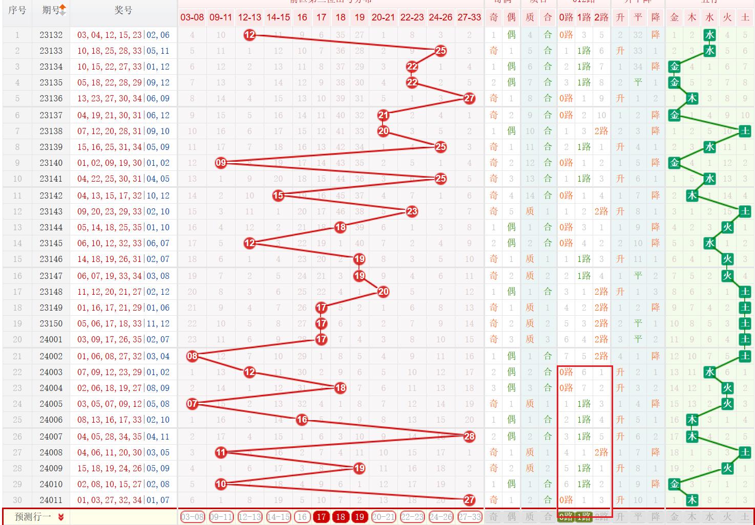 从第3位出号012路属性来看,近10期内0路出号后下期一般会开出0路或1路号码;故本期第3位应该主要考虑0路或1路号码;因此本期第3位可能为17-18-19。