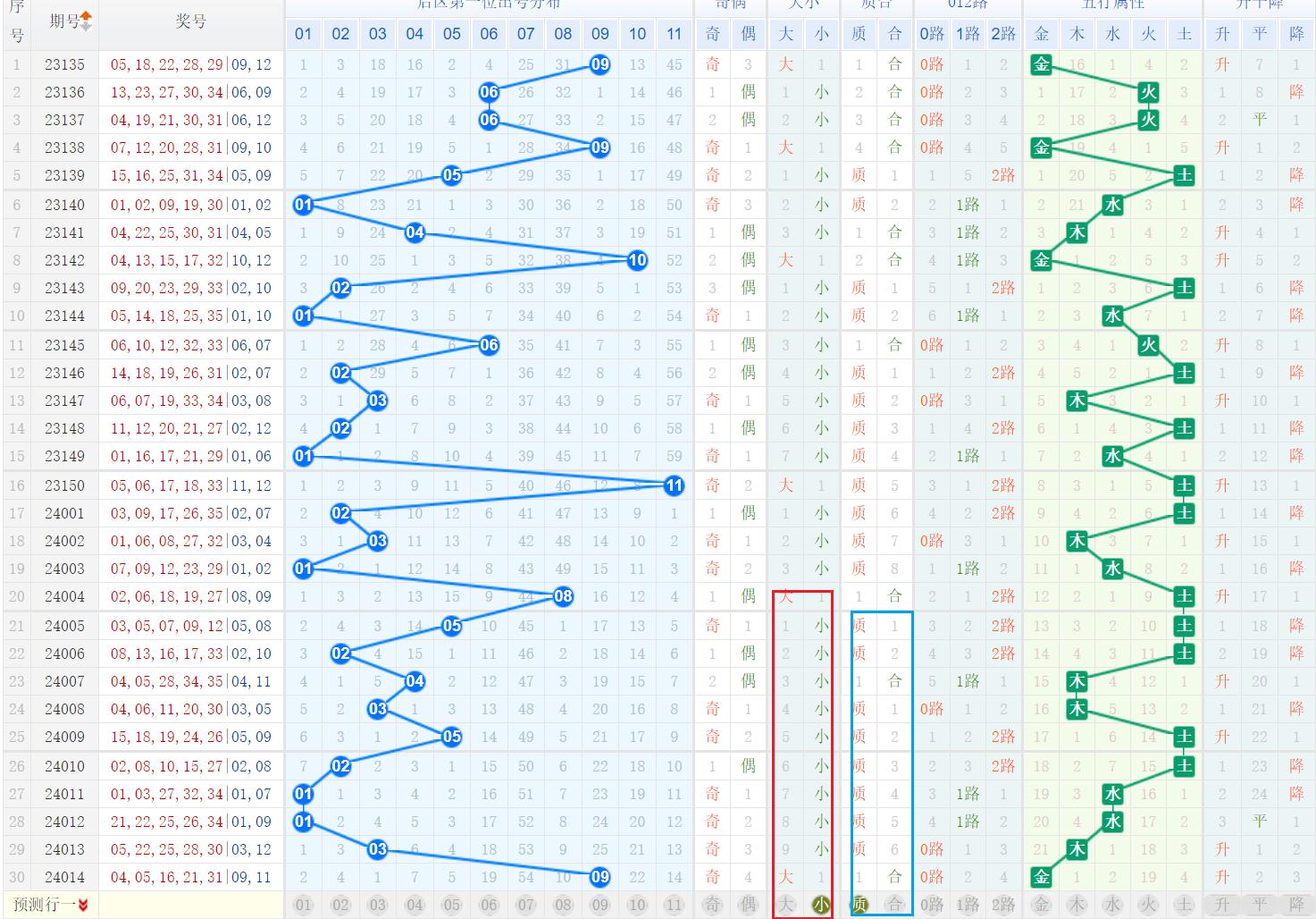 上一期后区第2位开出号码为11,为奇数、大数、质数、2路号码。