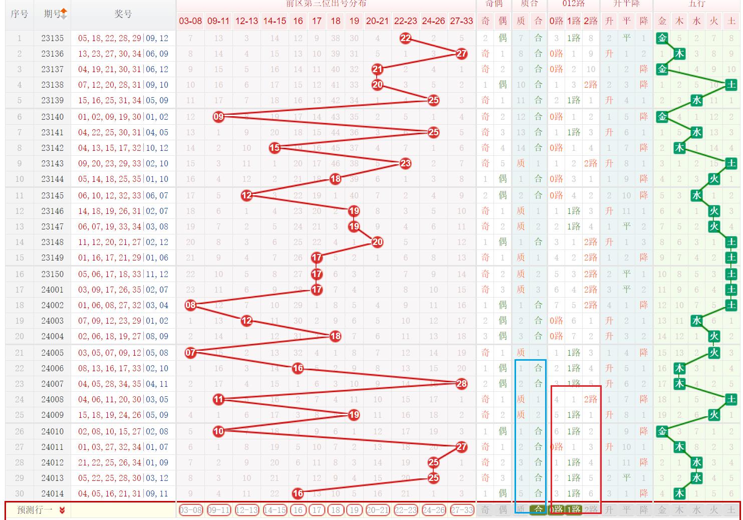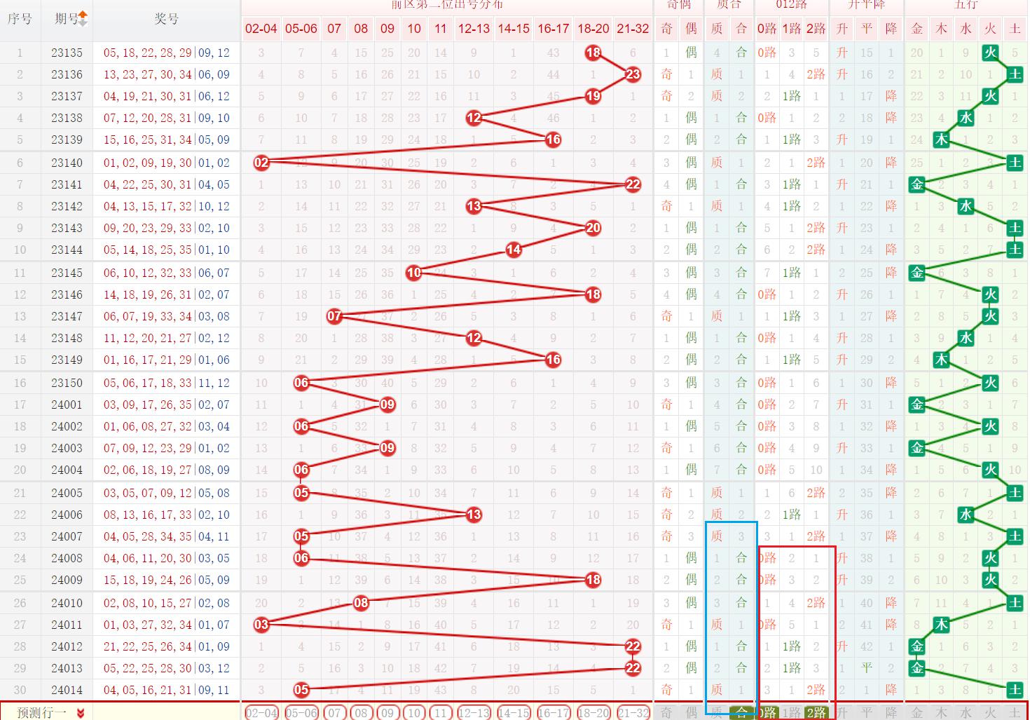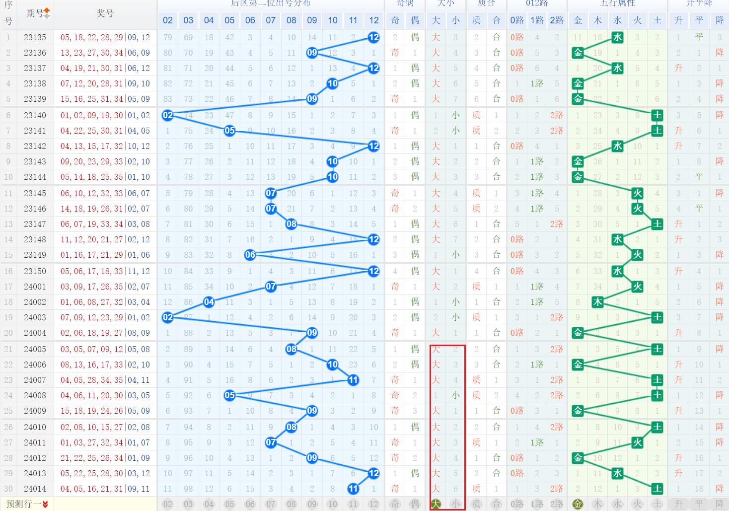 从第2位出号分布图可以看出,第2位出号在03-15之间比较常见。上一期前区第2位开出05,为奇数、质数,2路号码。