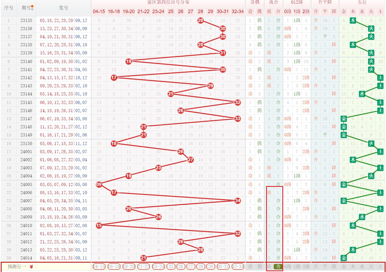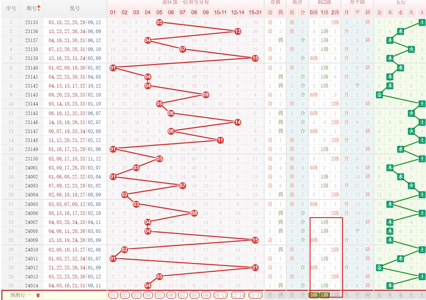 从第1位出号分布图可以看出,第1位出号在01-10之间比较常见。上期前区第1位开出号码为04,为偶数、合数、1路号码。