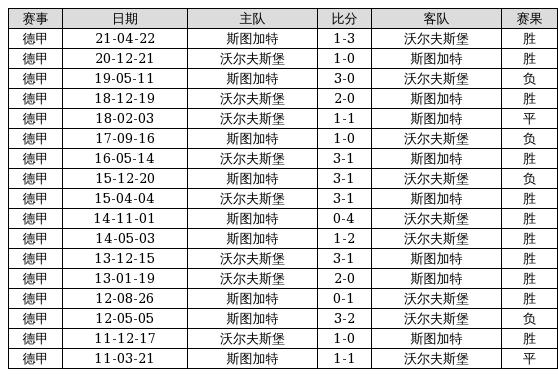 沃尔夫斯堡 VS 斯图加特两队近10年的交战次数为17场,沃尔夫斯堡11胜2平4负,赢球概率为64.7%,平局概率为11.8%,输球概率为23.5%。